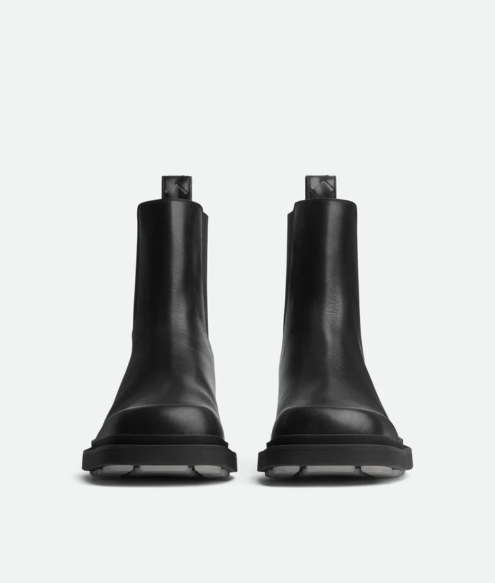 Descripción larga compactada:Bota Chelsea con puntera cuadrada confeccionada en piel de becerro lisa con suela de goma con tacos.