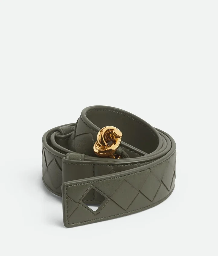 Descripción larga compactada:Cinturón en piel napa Intrecciato con hebilla de nudo Knot.