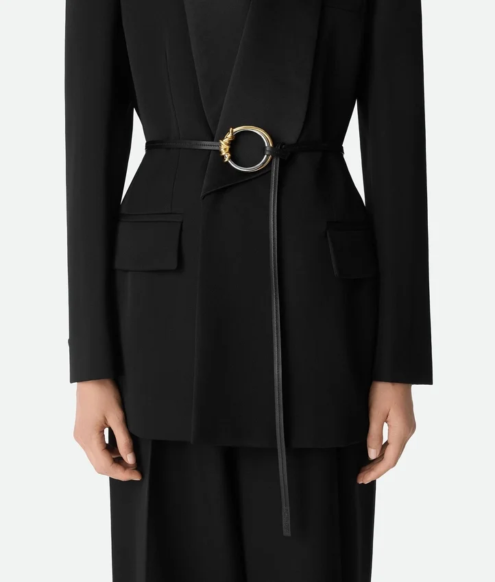 Descripción compacta (extensa):Cinturón de piel de becerro lisa con hebilla de anilla metálica en contraste con acabado dorado y cierre de Knot.