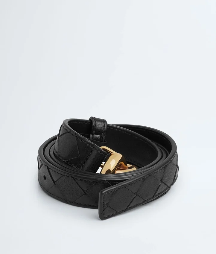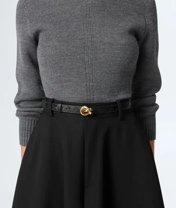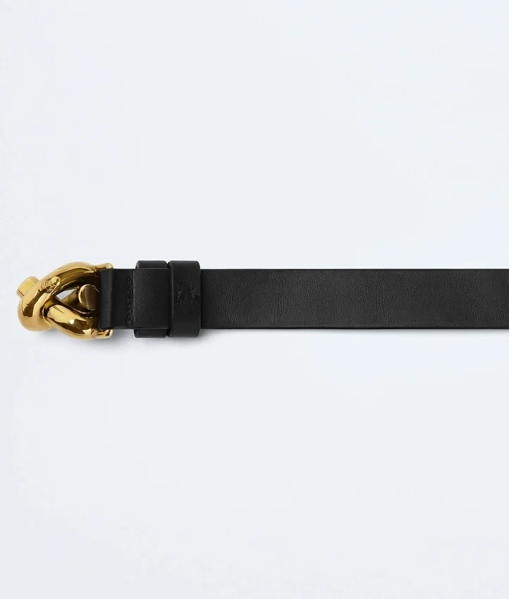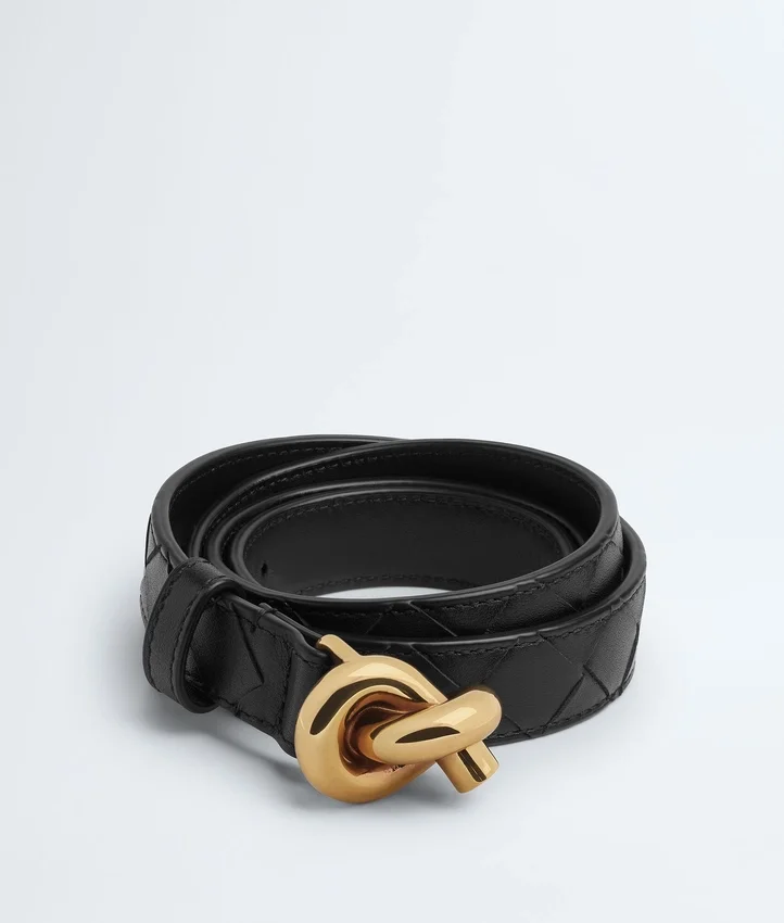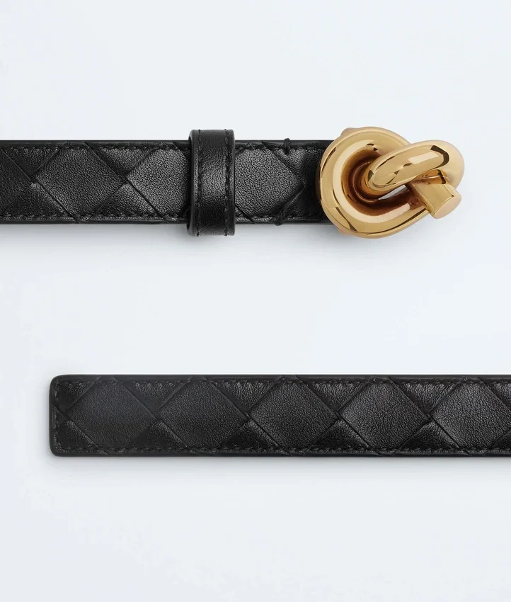 Descripción larga compactada:Cinturón en piel de becerro sedosa Intrecciato con hebilla de nudo característica.