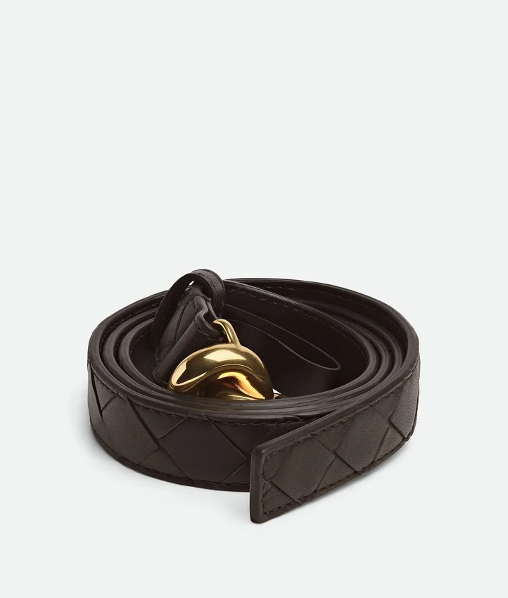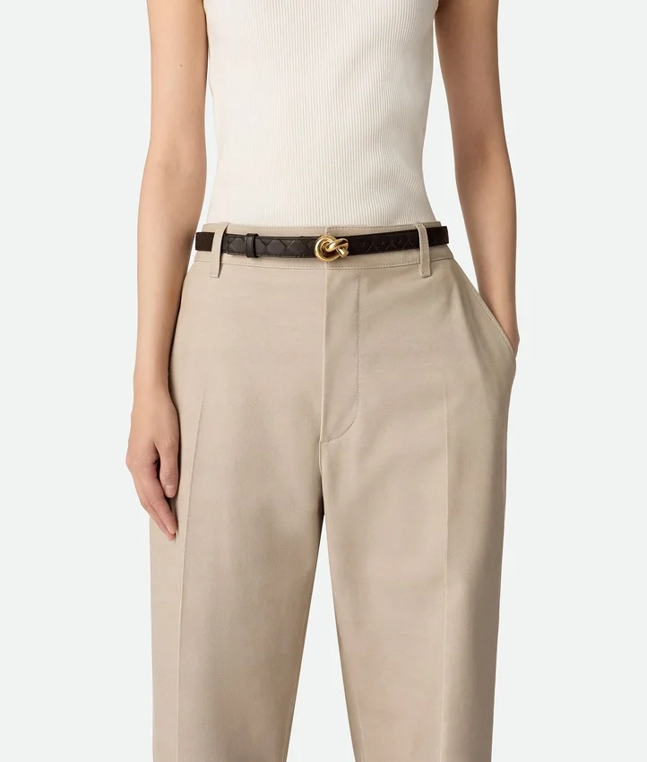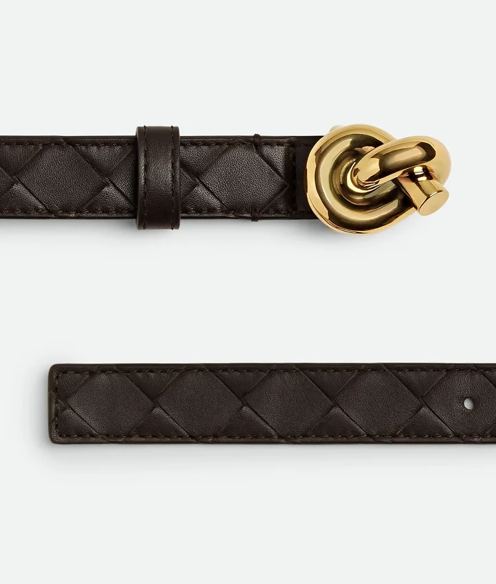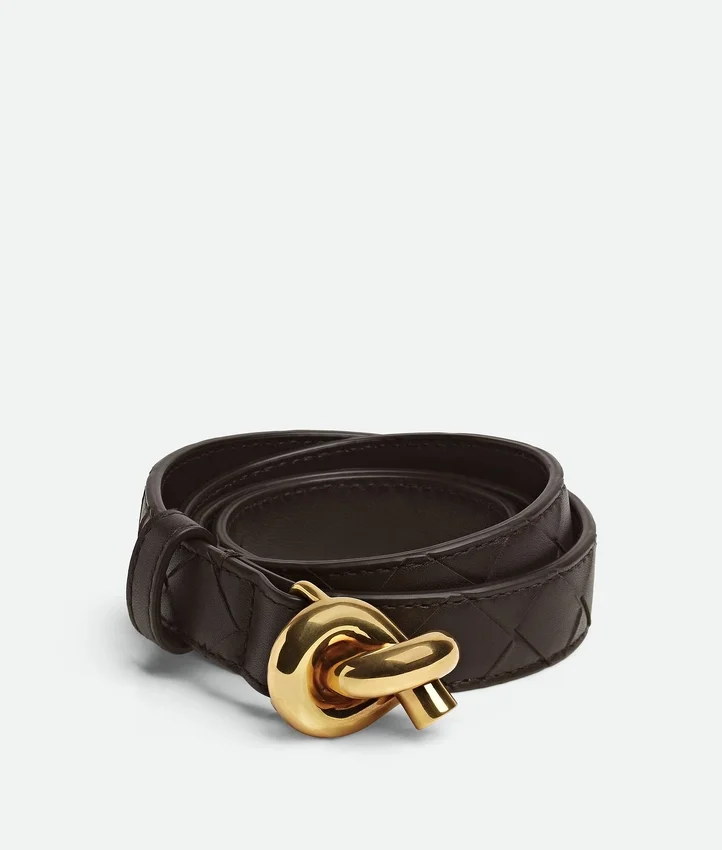Descripción larga compactada:Cinturón en piel de becerro sedosa Intrecciato con hebilla de nudo característica.