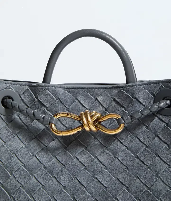 Descripción larga compactada:Bolso de mano en ante Intrecciato flexible con efecto denim, con el característico detalle del nudo y correa cruzada deslizante.