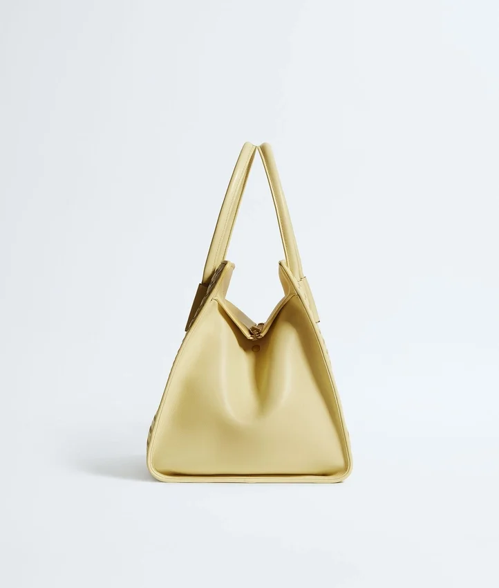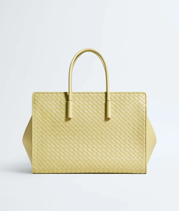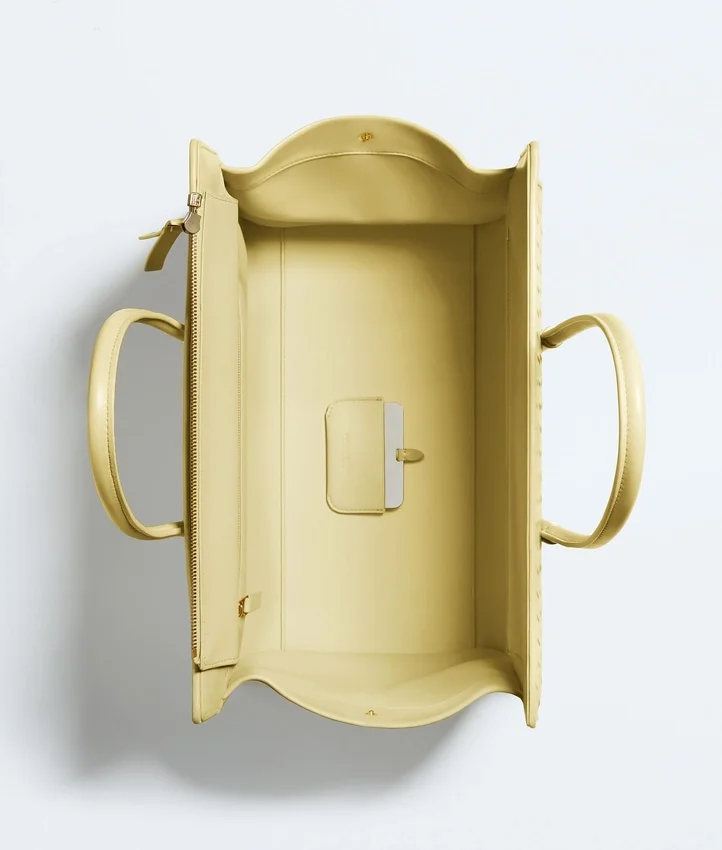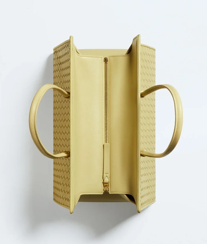 Descripción compacta (larga):Bolso tote con cremallera y silueta estilizada, confeccionado con la técnica Intrecciato en suave piel napa. Incorpora cierres de botón a presión en los laterales interiores para organizar la bolsa protectora.