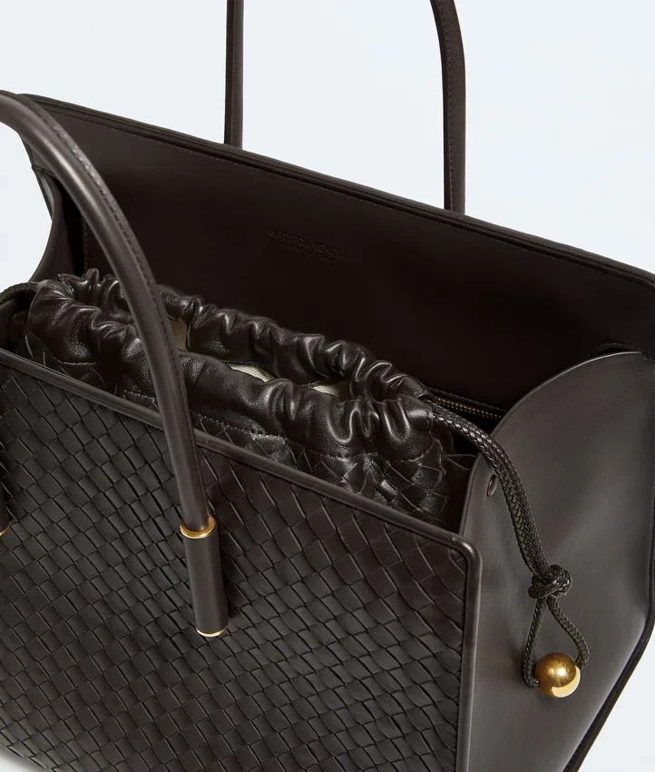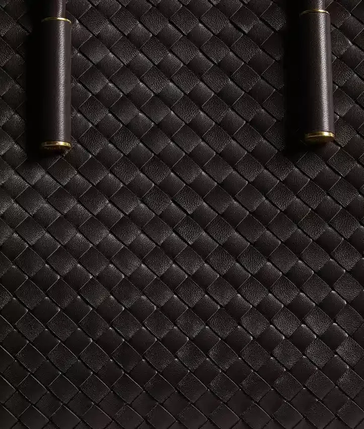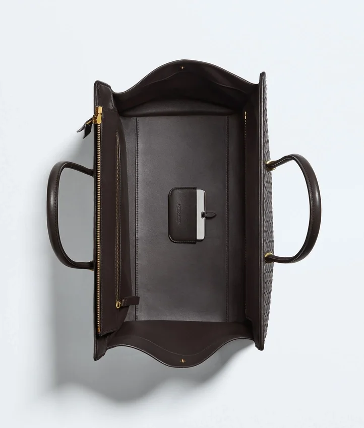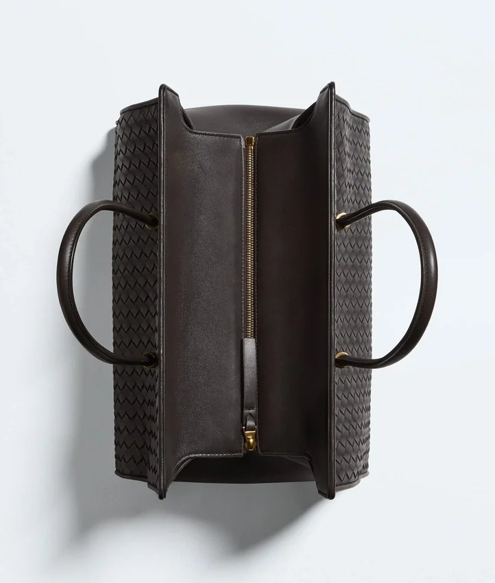 Descripción larga compactada:Bolso tote con cremallera y silueta estilizada, confeccionado con la técnica Intrecciato en suave piel napa. Con cierres de botón a presión en los laterales interiores para organizar la bolsa protectora.