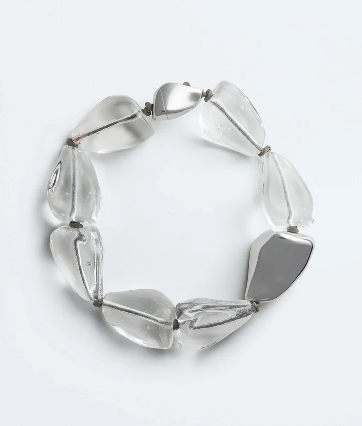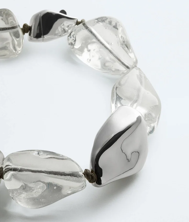 Descripción larga compactada:Collar con formas esculturales elaborado en plata de ley y vidrio artesanal.