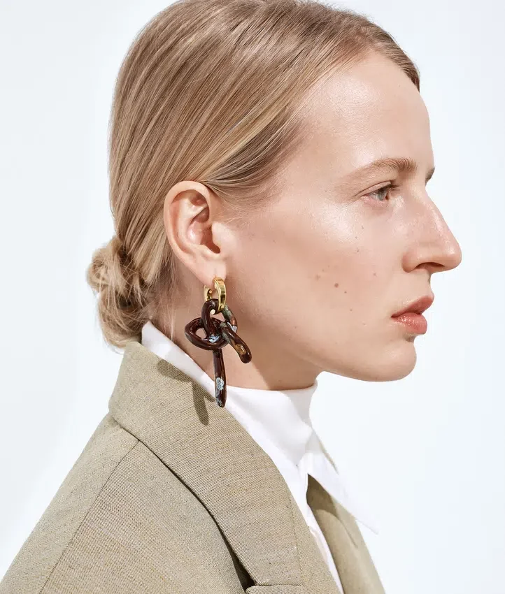 Descripción compacta (larga):Pendiente de aro único en plata de ley con acabado en oro de 18 quilates, con un Knot característico en cerámica de color con forma inspirada en un corazón.