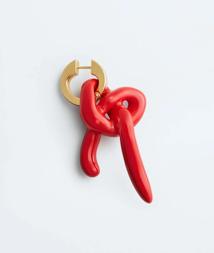 Descripción larga compactada:Pendiente de aro único en plata de ley con acabado en oro de 18 quilates, con un Knot característico en cerámica esmaltada a mano con forma inspirada en un corazón.