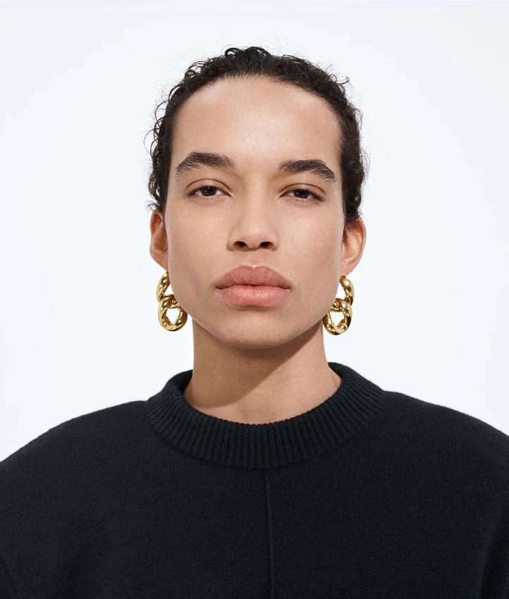 Descripción larga compactada:Pendientes con cadena escultural fabricados en plata de ley con acabado en oro de 18 quilates.