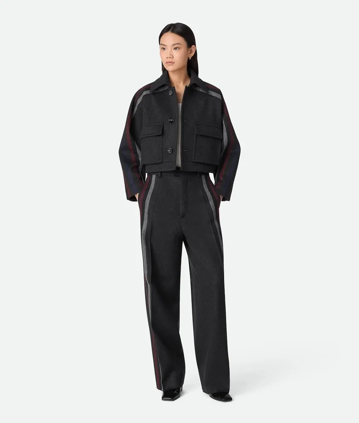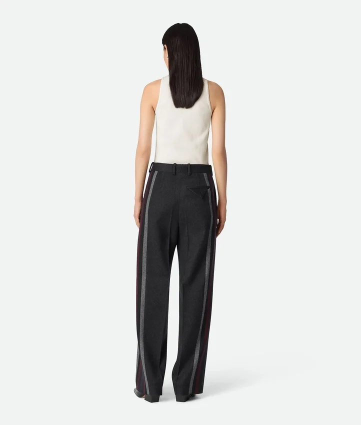 Descripción larga compactada:Pantalones de pierna ancha en doble tejido de lana y cachemira con rayas en los laterales.