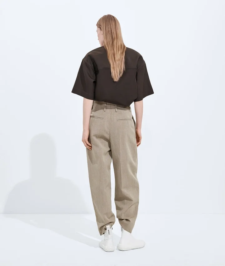 Descripción larga compactada:Pantalones de pierna cónica en toile de mezcla de lana y lino.