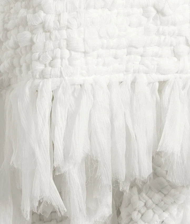 Descripción compacta (larga):Top con espalda abierta y silueta asimétrica confeccionado con la técnica artesanal Intrecciato tejida a mano en gasa de seda.
