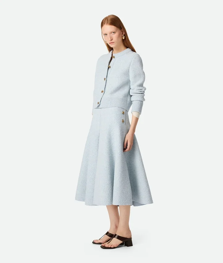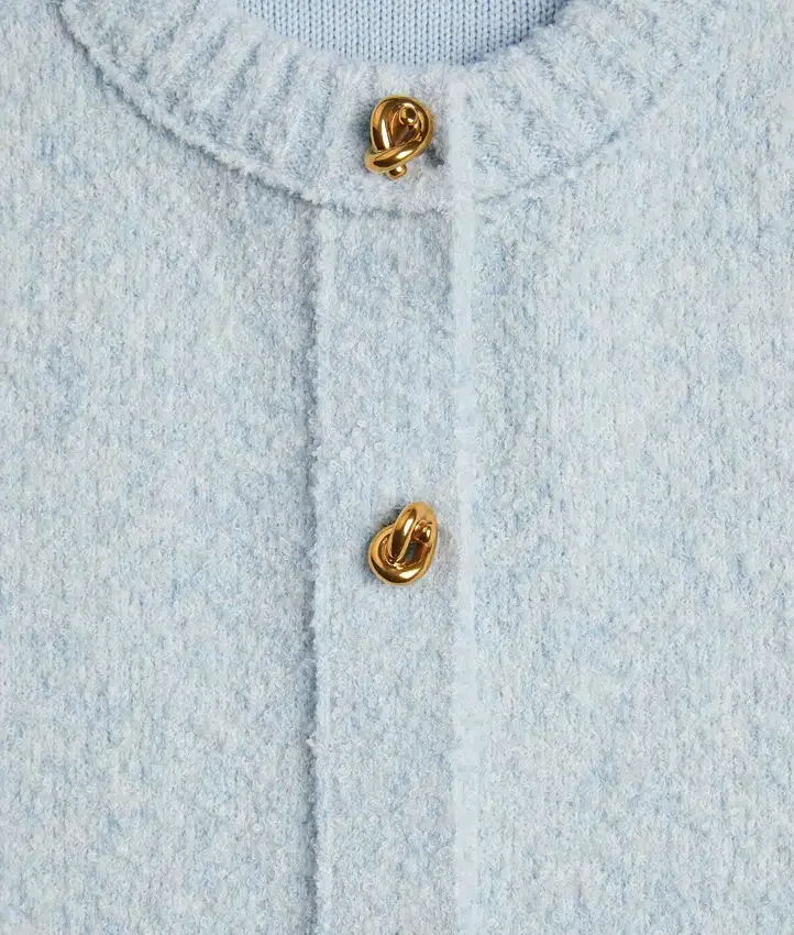 Descripción larga compactada:Cárdigan de lana bouclé con detalles de botones metálicos con nudo.