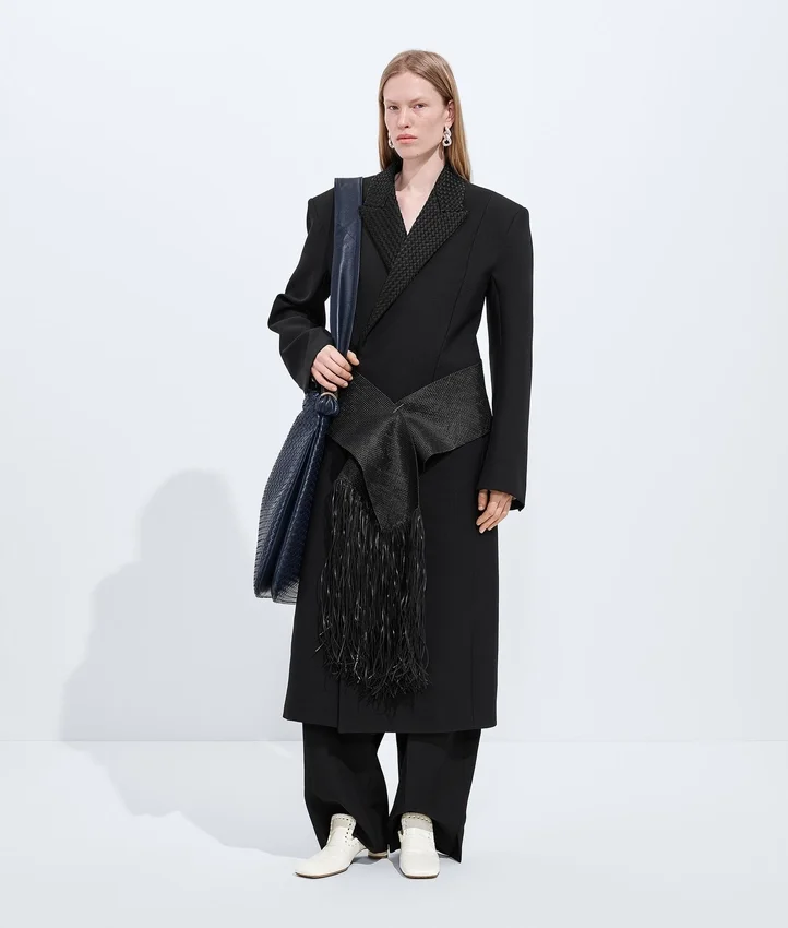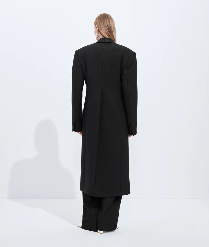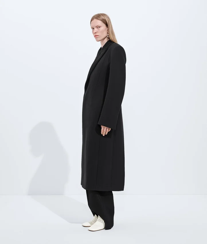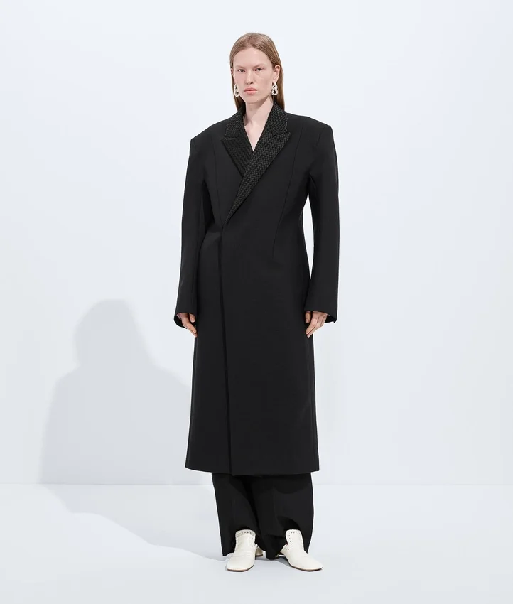 Descripción larga compactada: Abrigo con hombros esculturales inspirados en el estilo Cabat, confeccionado en lana y mohair separables, con solapas Intrecciato.
