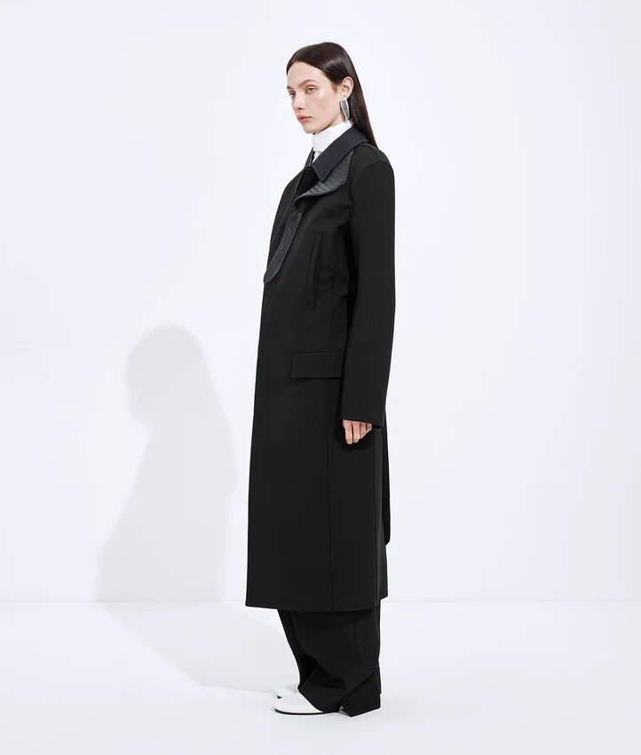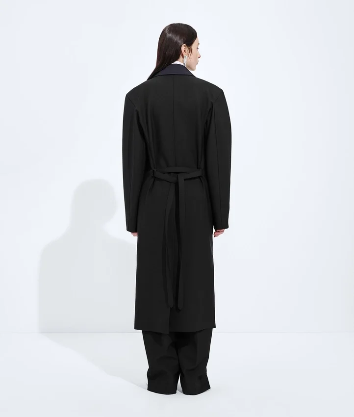 Descripción larga compactada: Gabardina con hombros esculturales inspirados en el estilo Cabat, confeccionada en lana y mohair de doble tejido, con un cierre desmontable de cuero Intrecciato en el cuello.