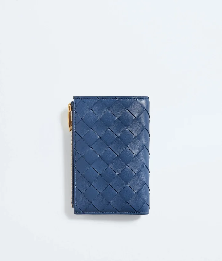 Descripción larga compactada:Cartera doble mediana en piel napa Intrecciato.