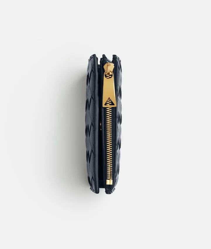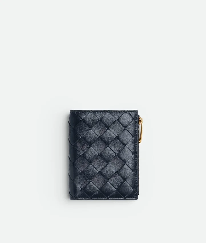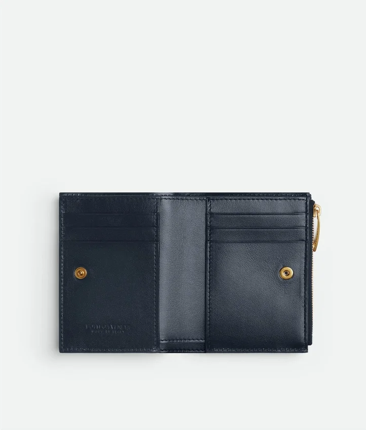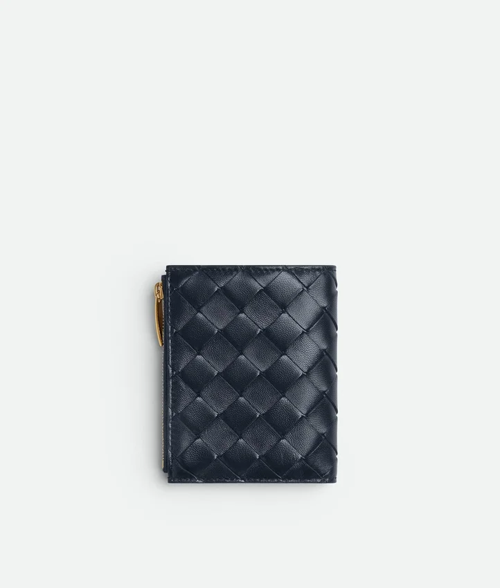 Descripción larga compactada:Cartera pequeña plegable en piel napa Intrecciato.