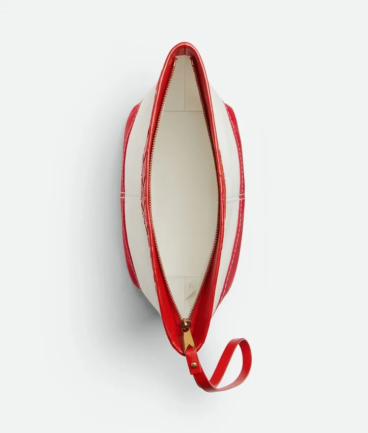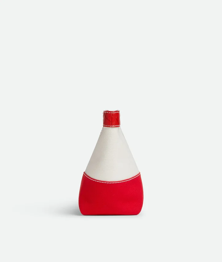 Descripción larga compactada:Pouch mediano de lona bicolor con ribete de piel Intrecciato en contraste y correa de muñeca desmontable.