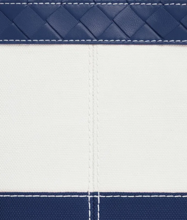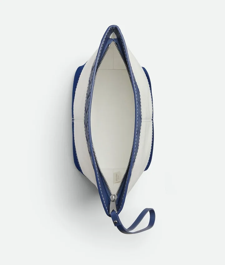 Descripción larga compactada:Pouch mediano de lona bicolor con ribete de piel Intrecciato en contraste y correa de muñeca desmontable.