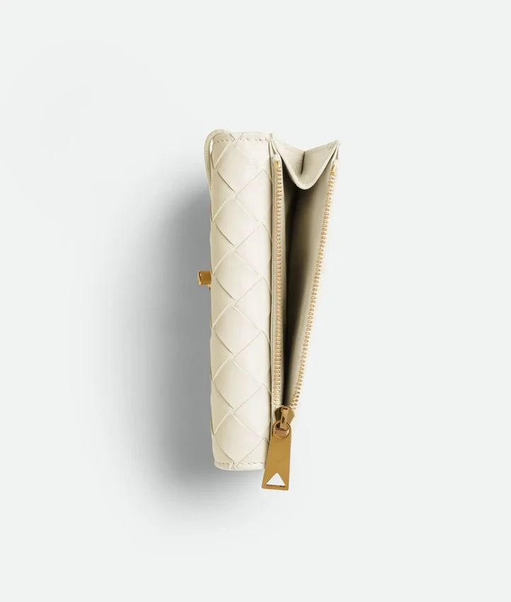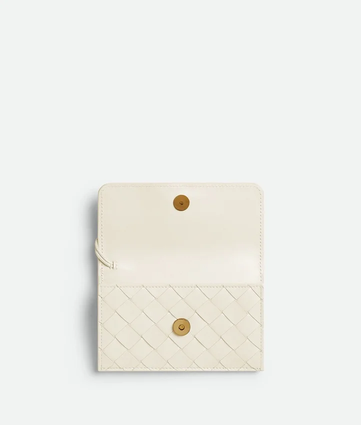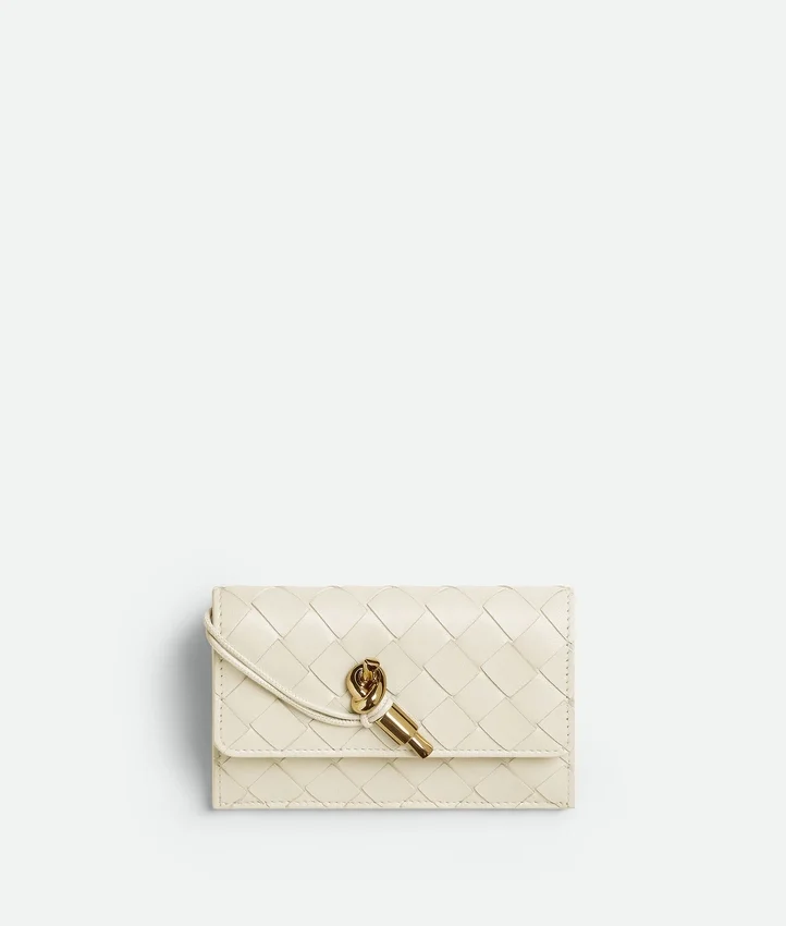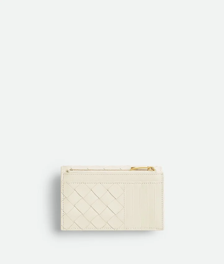 Descripción compacta (larga):Tarjetero con cremallera en piel napa Intrecciato con el detalle del Knot característico.