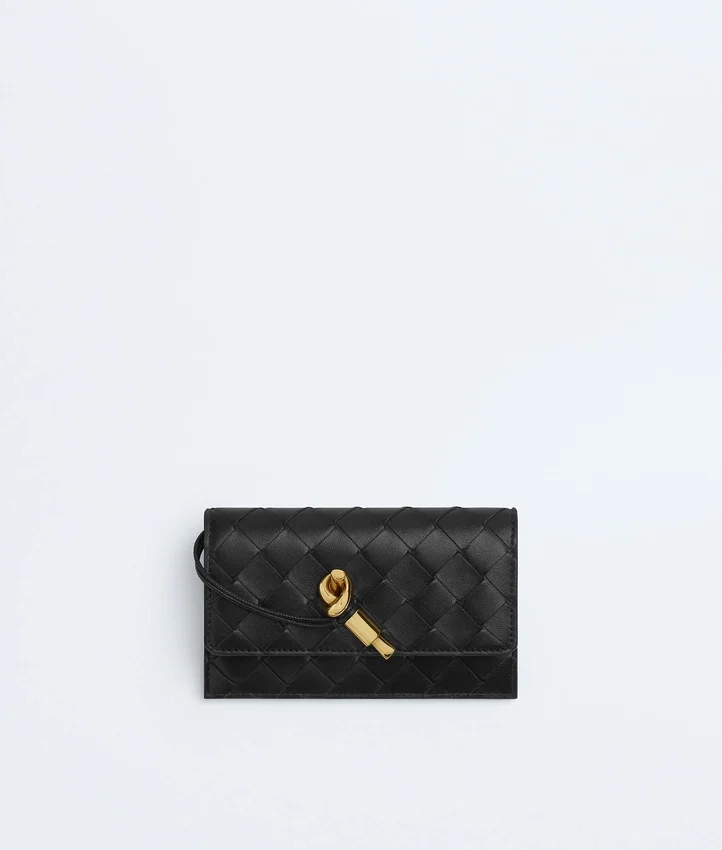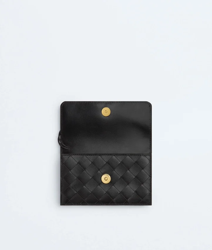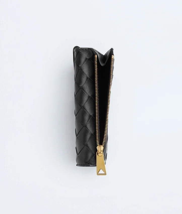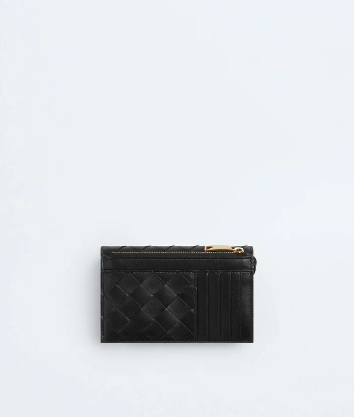 Descripción larga compactada:Tarjetero con cremallera en piel napa Intrecciato con detalle del Knot característico.