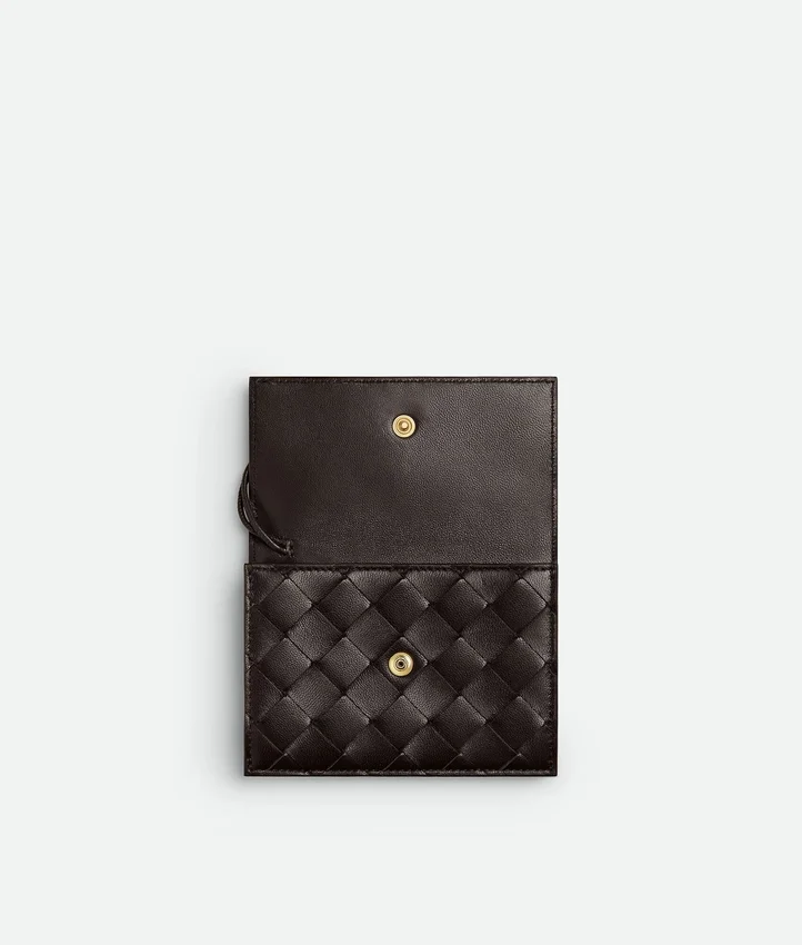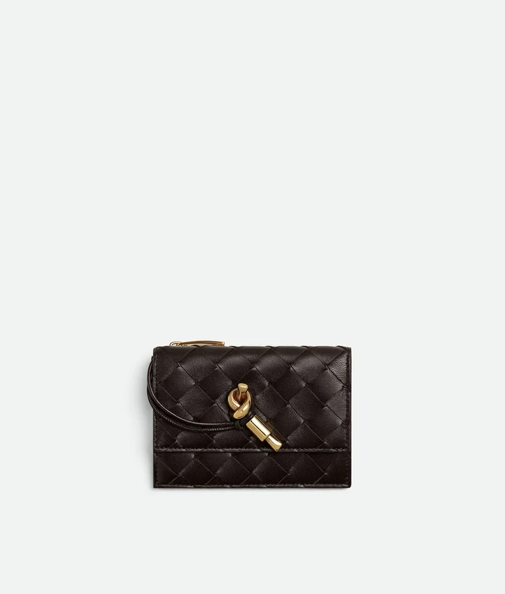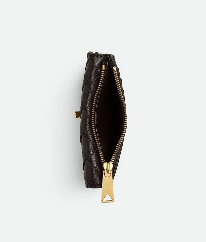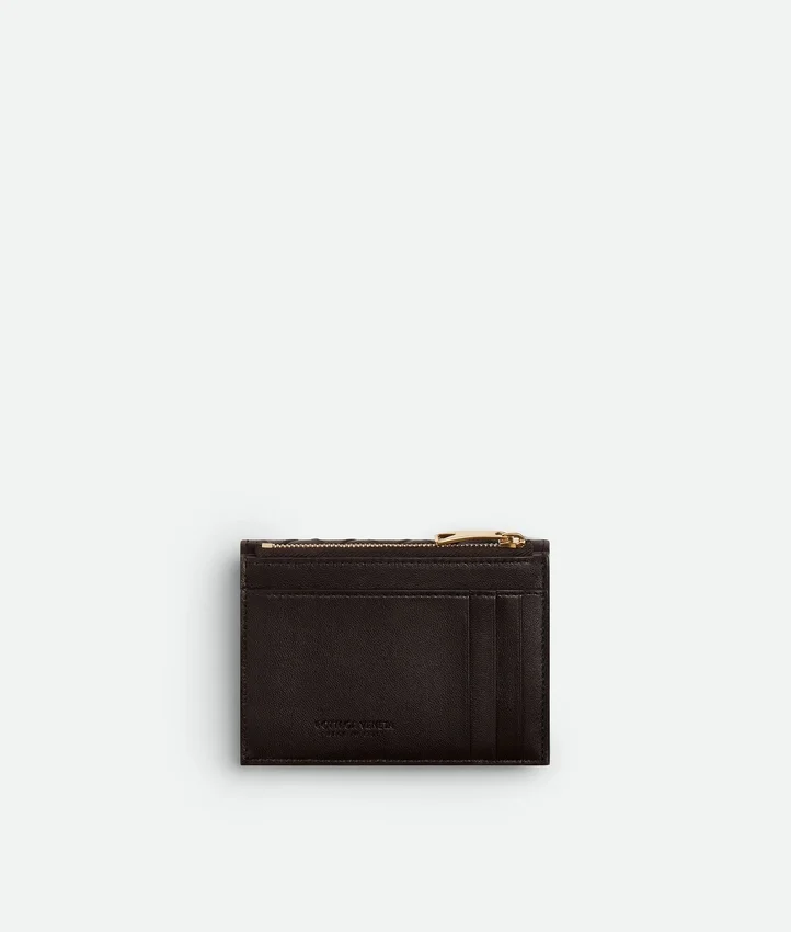 Descripción larga compactada:Tarjetero delgado con cremallera en piel napa Intrecciato con detalle de nudo característico.