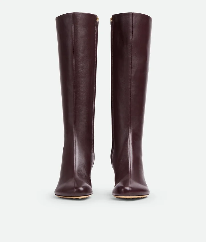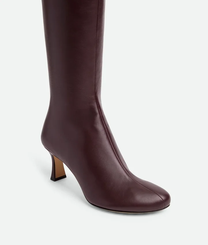 Descripción larga compactada:Bota alta hasta la rodilla en piel napa flexible con puntera almendrada.