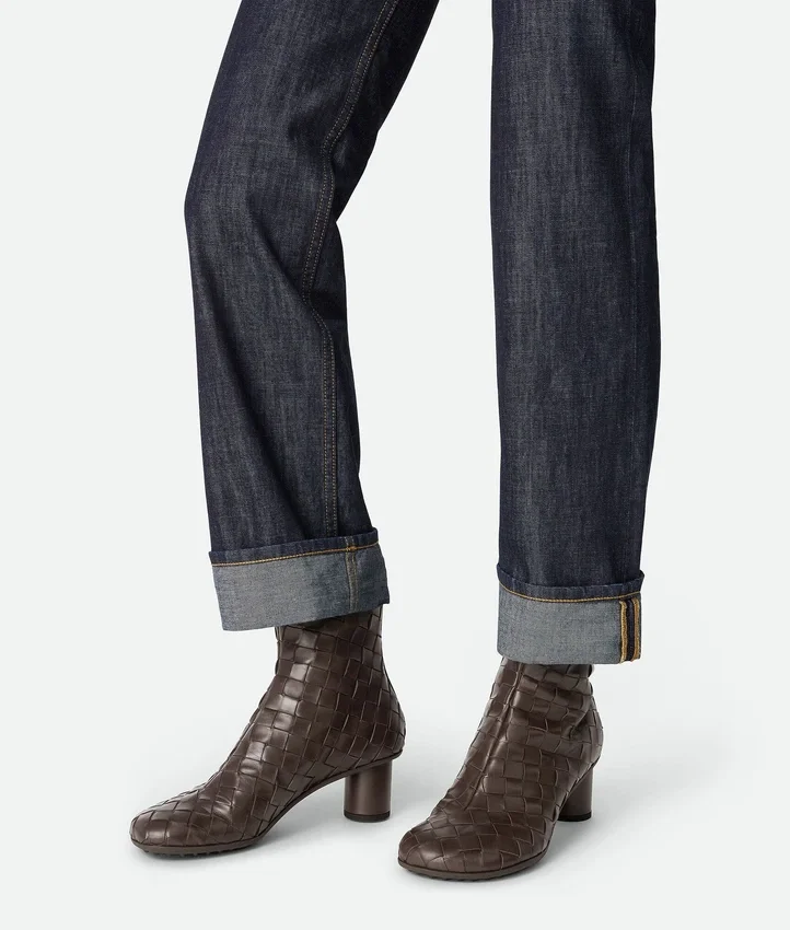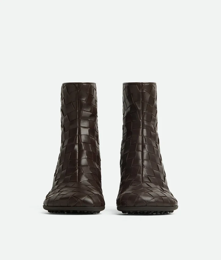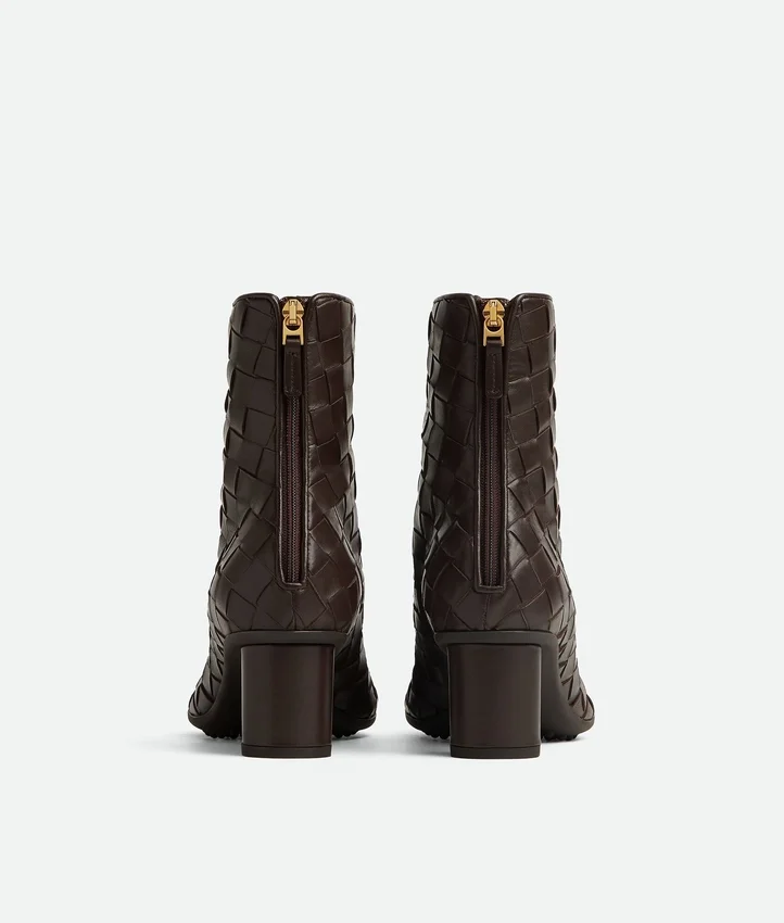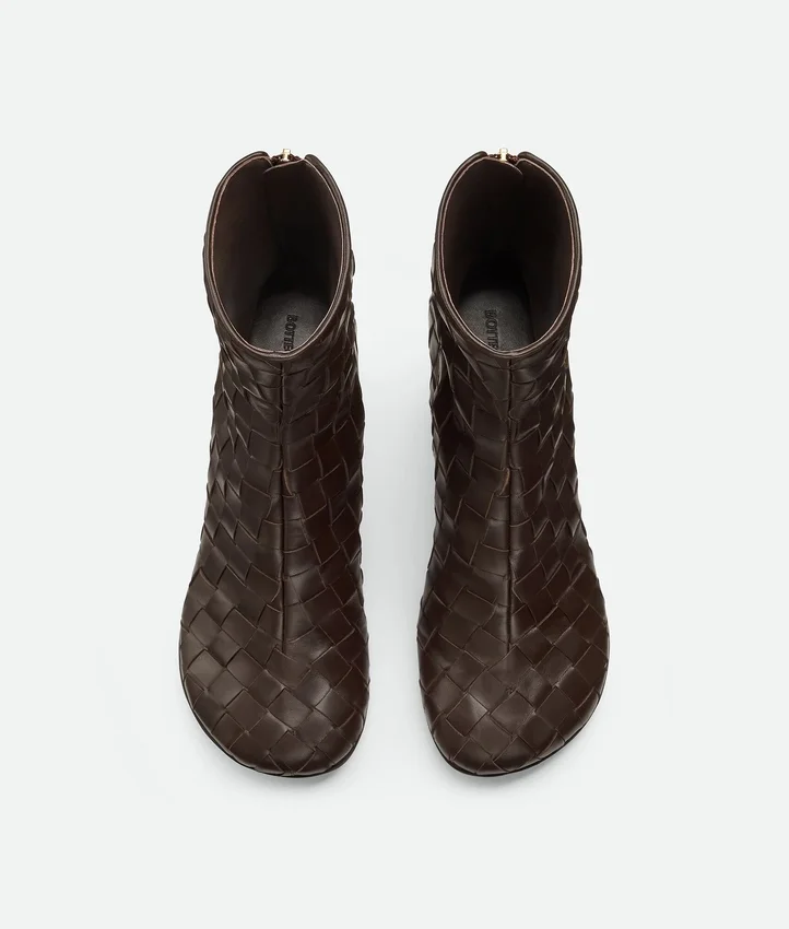 Descripción larga compactada:Botas de tacón bajo confeccionadas en piel de cordero con el diseño Intrecciato.